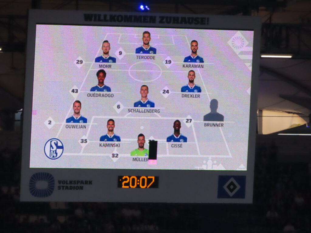 Als Dino Hermann am Gästeblock vorbeiwackelt, ertönt „Schalke ist die Macht“, die heimische Kurve springt ihrem Maskottchen schnell mit „HSV HSV HSV“ zur Seite. Noch etwas Schmalz „Hamburg hier gehör‘ ich hin“ vom Band und die Aufstellung des Gastgebers, dann marschieren die Mannschaften ein.