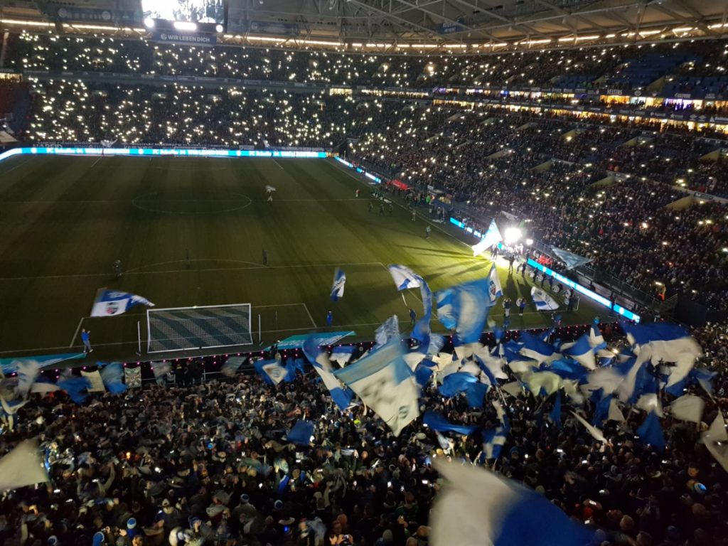 3. Januar 2020Zum Ende des Monats schlägt „Eisern“ Union Berlin trotz Freitagabendtermins mit fast 5.000 Roten zum ersten Pflichtspiel auf Schalke auf. Vor dem Anpfiff wird der Schalker Jahrhunderttrainer Huub Stevens zum 66. Geburtstag mit einem Ständchen aus 60.000 Kehlen gefeiert; anschließend zieht die Nordkurve einen riesigen Wimpel mit ihrem Fahnenschwenker-Logo hoch, der von vielen kleinen Fahnen und einigen Blitzlichtern und blauen und weißen Rauchtöpfen flankiert wird.
