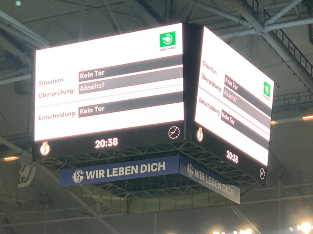 Nach sehr ausgeglichenen und guten 20 Minuten reißt es die Schalker von den Sitzen: Matondo schießt im Bayern-Strafraum Tolisso an, der Ball prallt weiter zu Burgstaller und Burgi nagelt die Kugel mit viel Wumms in Netz. Jaaaaaaa…aaaah? Nein, die Fahne ist oben, Burgstaller stand im Abseits. Verdammt, das wäre es gewesen – und keinem hätten die Schalker es mehr gegönnt als Burgi, dessen unermüdliche Rackerei in dieser Saison bisher nicht belohnt wurde. Abseits sagt leider auch der VAR; der Nordkurve gefällt das nicht und sie intoniert „Ihr macht uns‘ren Sport kaputt“ und „Wir singen Scheixx FC Bayern“.