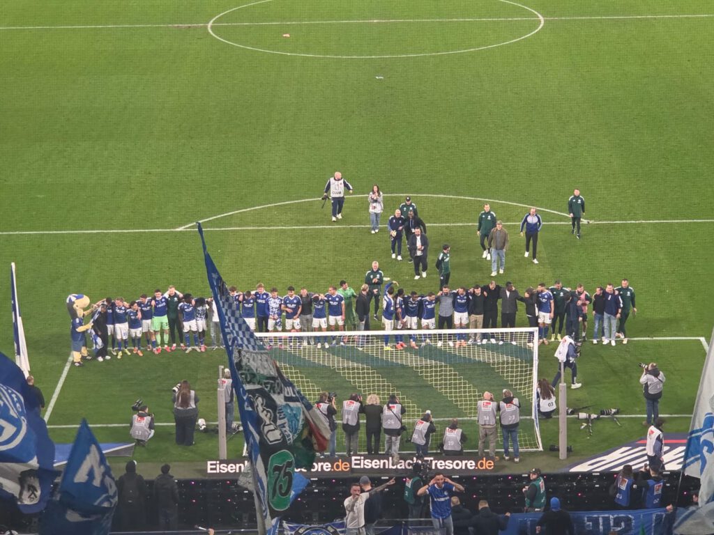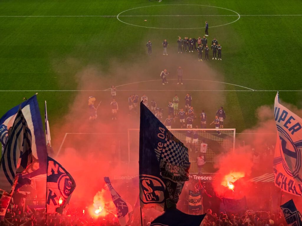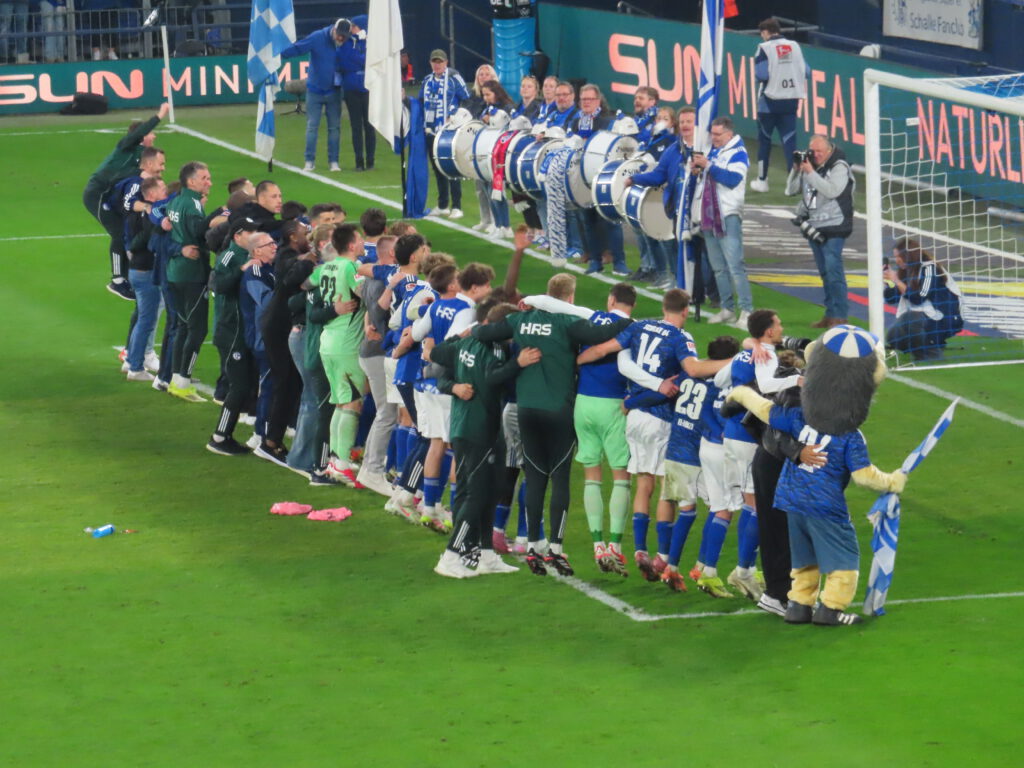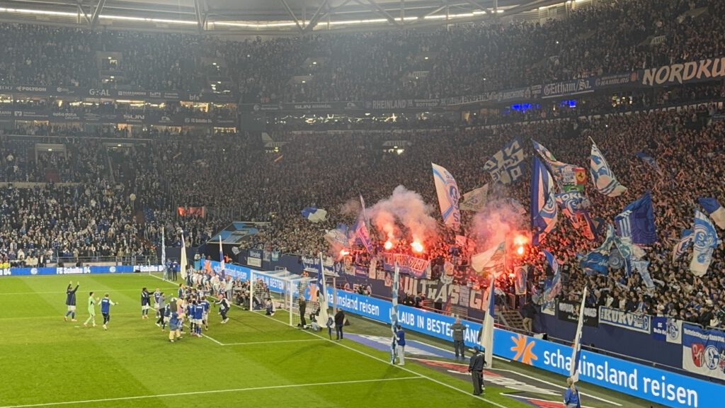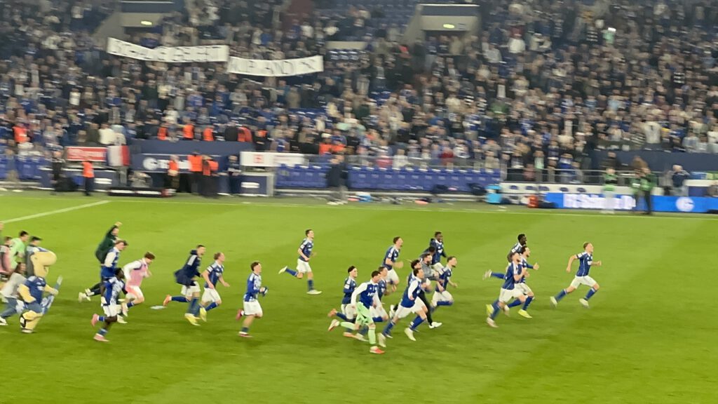 Der Stein, der allen Schalkern von den Herzen plumpst, ist riesig, zumal Verfolger Elversberg sein Heimspiel gegen Magdeburg ebenfalls mit 1:0 gewonnen hat. Dementsprechend groß ist der Jubel, als die Mannschaft den „Lockrufen“ erliegt und ausgelassen Richtung Kurve stürmt, angeführt von Timo Becker. In N3 und in Block I flammen einige rote Bengalos auf und Mannschaft wir Fans hüpfen ausgelassen herum und feiern drei hart erkämpfte Punkte. Besonders schön ist, dass die Mannschaft mit der großen Jubelwelle zu „Geh’n mit Dir auf jede Reise“ wartet, bis auch die angeschlagenen Spieler aufgeschlossen haben. Zu „Spitzenreiter, Spitzenreiter“ geht es dann auf die Stadionrunde.