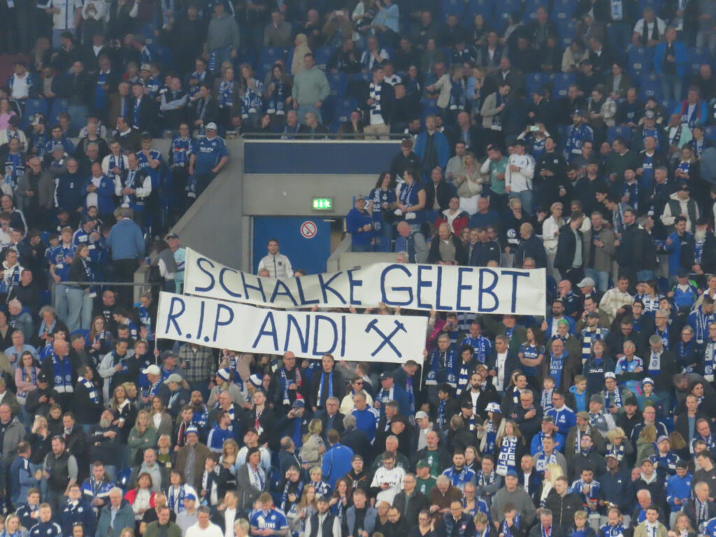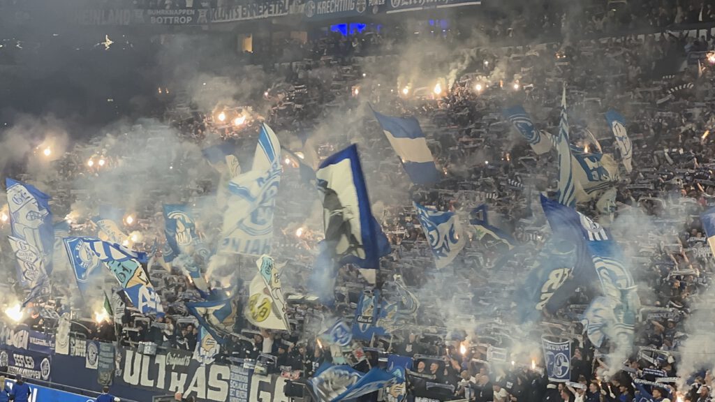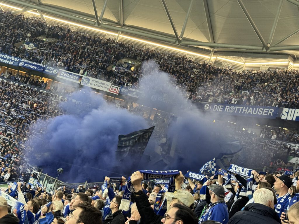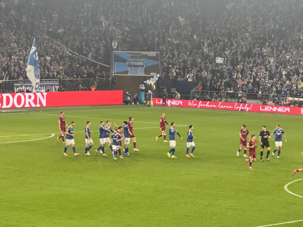 Der Stein, der allen Schalkern von den Herzen plumpst, ist riesig, zumal Verfolger Elversberg sein Heimspiel gegen Magdeburg ebenfalls mit 1:0 gewonnen hat. Dementsprechend groß ist der Jubel, als die Mannschaft den „Lockrufen“ erliegt und ausgelassen Richtung Kurve stürmt, angeführt von Timo Becker. In N3 und in Block I flammen einige rote Bengalos auf und Mannschaft wir Fans hüpfen ausgelassen herum und feiern drei hart erkämpfte Punkte. Besonders schön ist, dass die Mannschaft mit der großen Jubelwelle zu „Geh’n mit Dir auf jede Reise“ wartet, bis auch die angeschlagenen Spieler aufgeschlossen haben. Zu „Spitzenreiter, Spitzenreiter“ geht es dann auf die Stadionrunde.