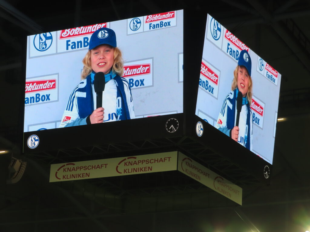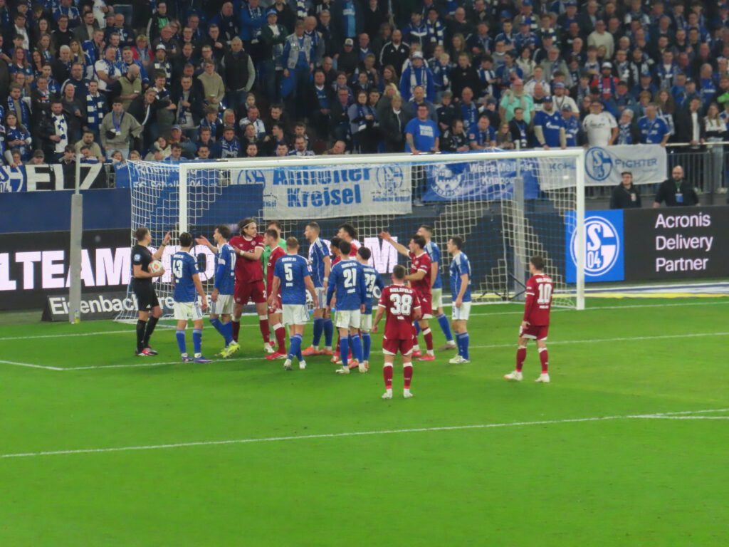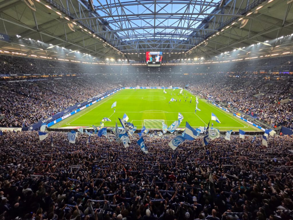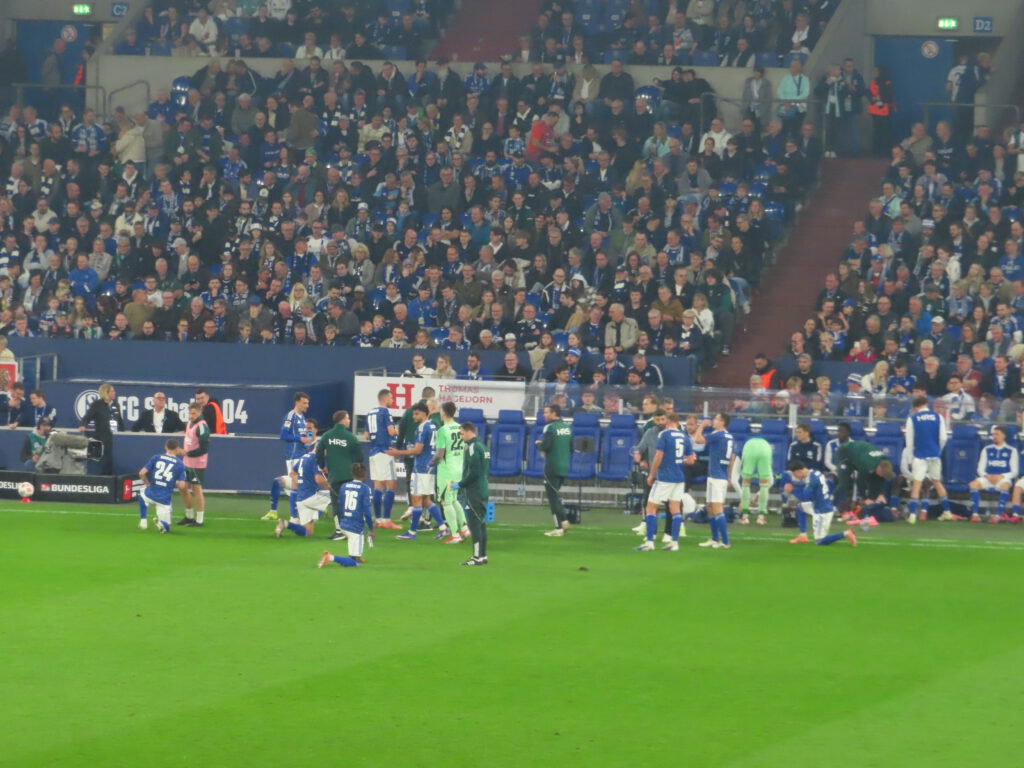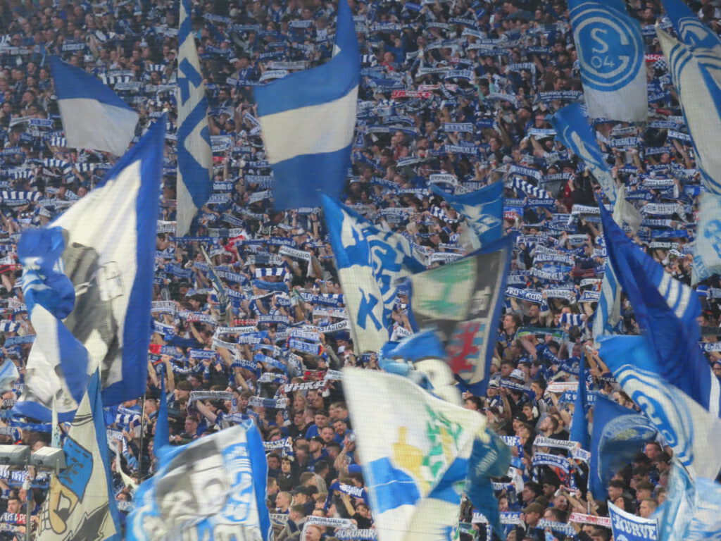 Der gutgefüllte Gästeblock ölt derweil schon mal deutlich hörbar die Kehlen, bis die Nordkurve in XXL-Lautstärke „Stadion geh’n, im Pappbecher Bier“ raushaut. Die Verlesung der Bielefelder Aufstellung wird mit „Hier regiert der S04!“ quittiert.