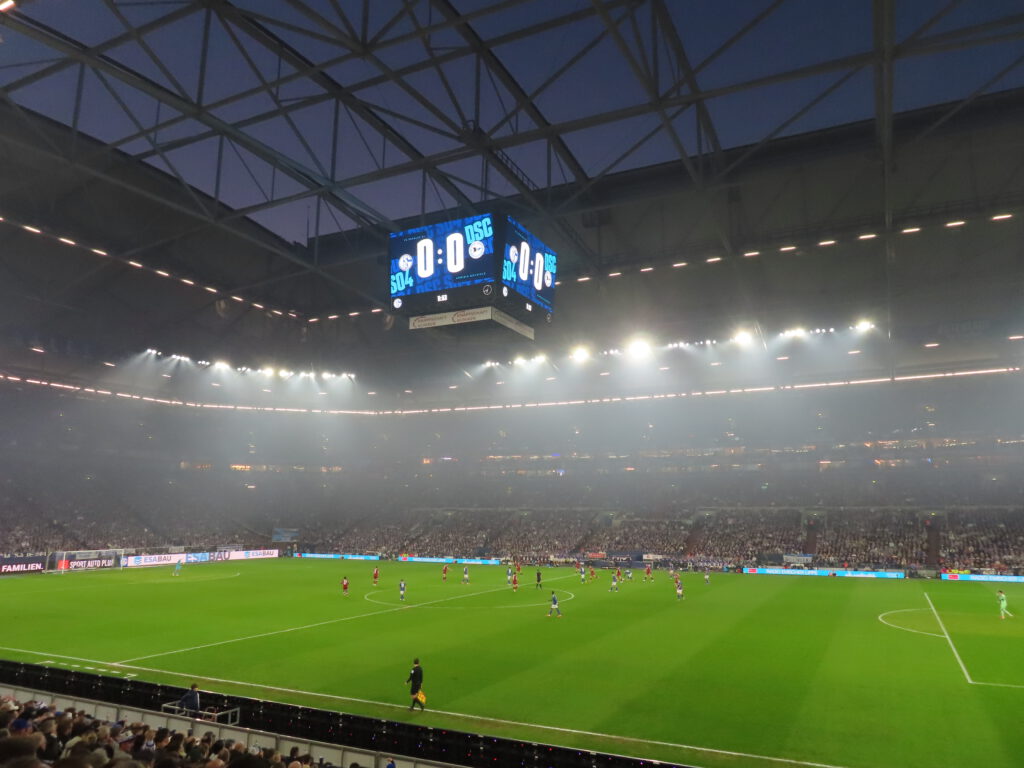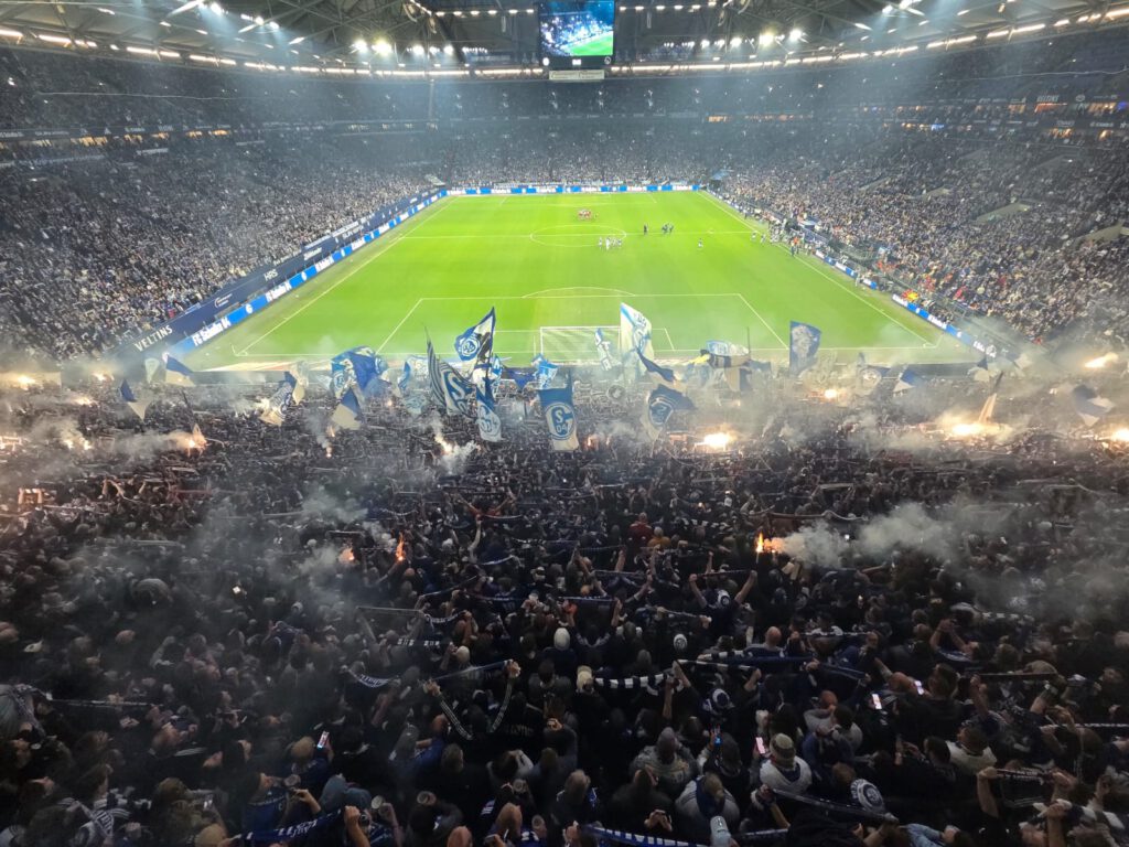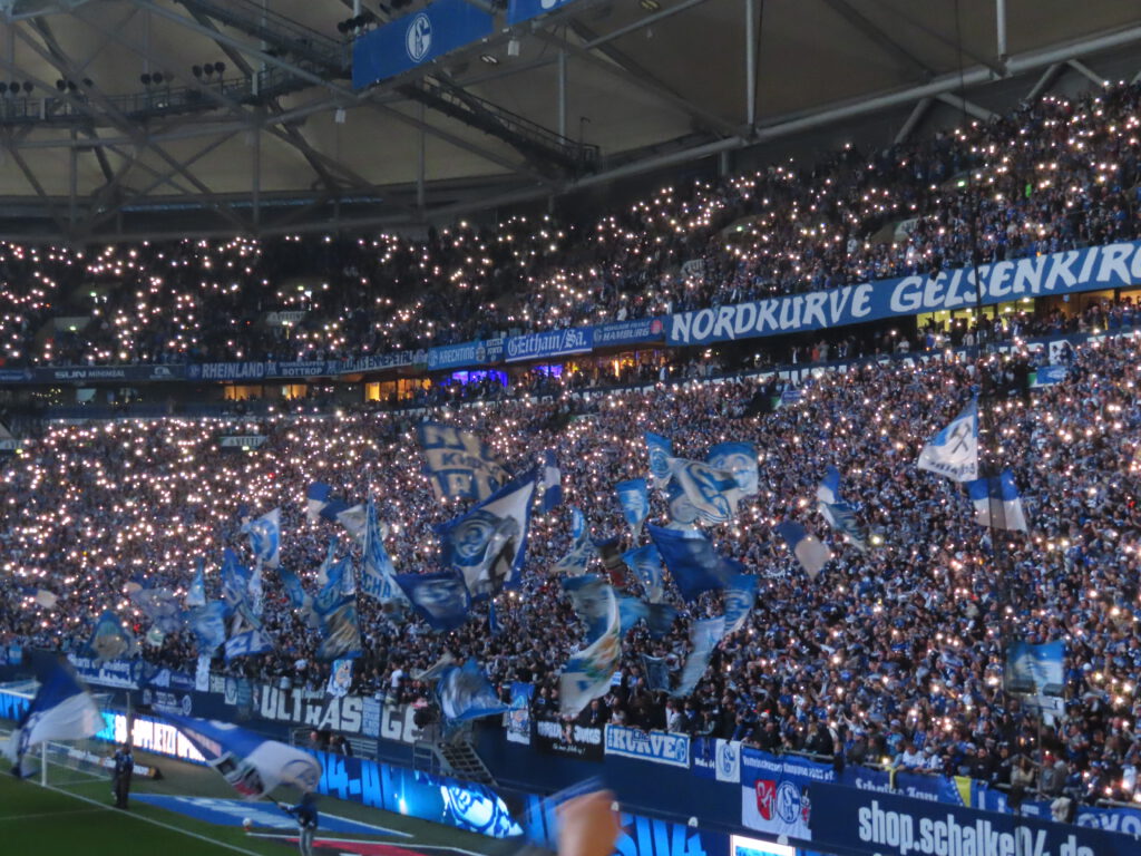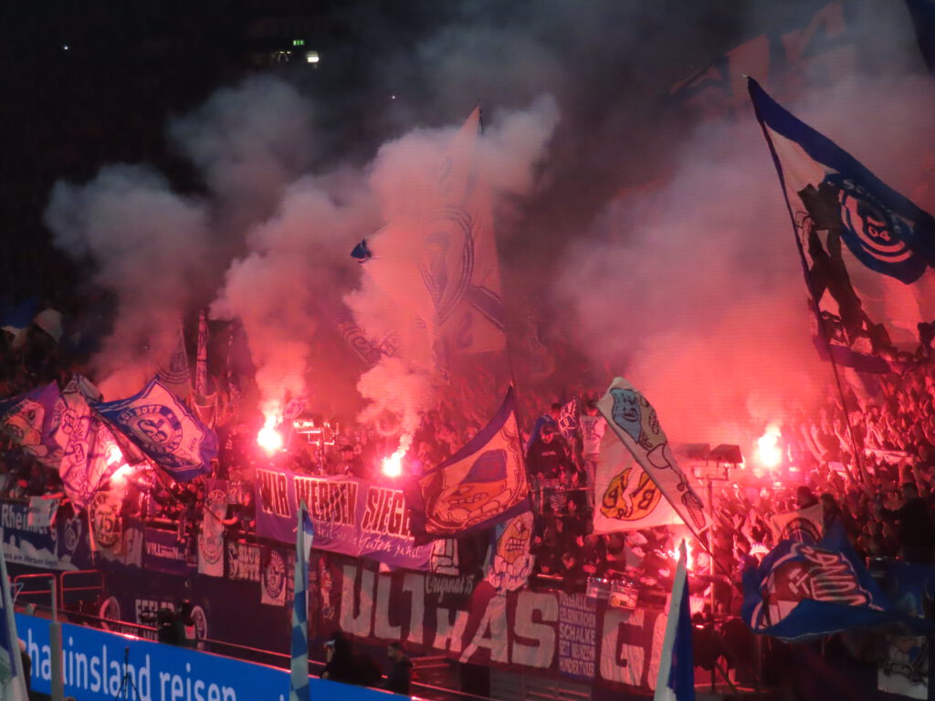 Während sich die Spieler zu den Klängen des Vereinslieds „Blau und Weiß, wie lieb ich Dich“ aufreihen, bietet die Nordkurve ein optisches Spektakel: Eingehüllt von blauen Rauchtöpfen an den Seiten erhellen zahlreiche weiße Stroboskoplichter die Szenerie. Los GEht’s!