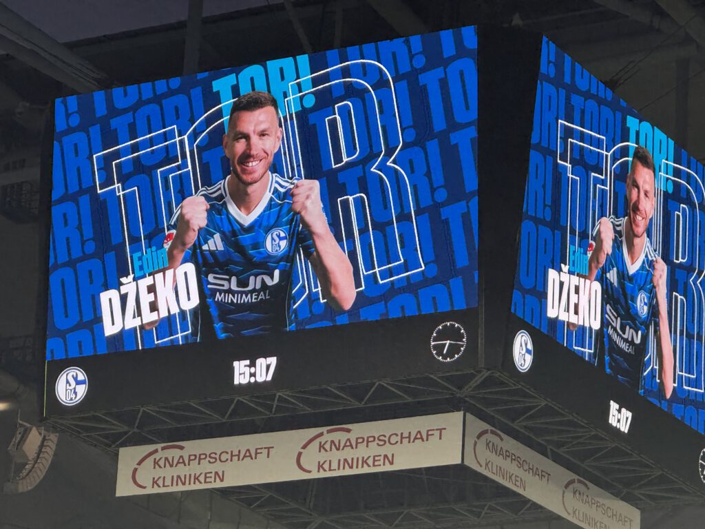 Der schwungvolle Beginn gefällt den Fans, da macht der Support mit Schalker Liedgut von „Steht auf“ und „Eine Stadt erstrahlt in Blau“ über „Auf geht’s Schalke kämpfen und siegen!“ bis zur Attacke doppelt Spaß. Mitten in „Für Deine Farben leben und sterben wir“ hinein platzt dann der umjubelte Führungstreffer: Ecke Aouchiche, Ayhan köpft aus kurzer Distanz an die Latte, von dort landet der Ball genau vor den Füßen von Dzeko, der sich natürlich nicht zweimal bitten lässt und mit dem rechten Fuß zum 1:0 trifft (15.). Ein Leben laaaaang…