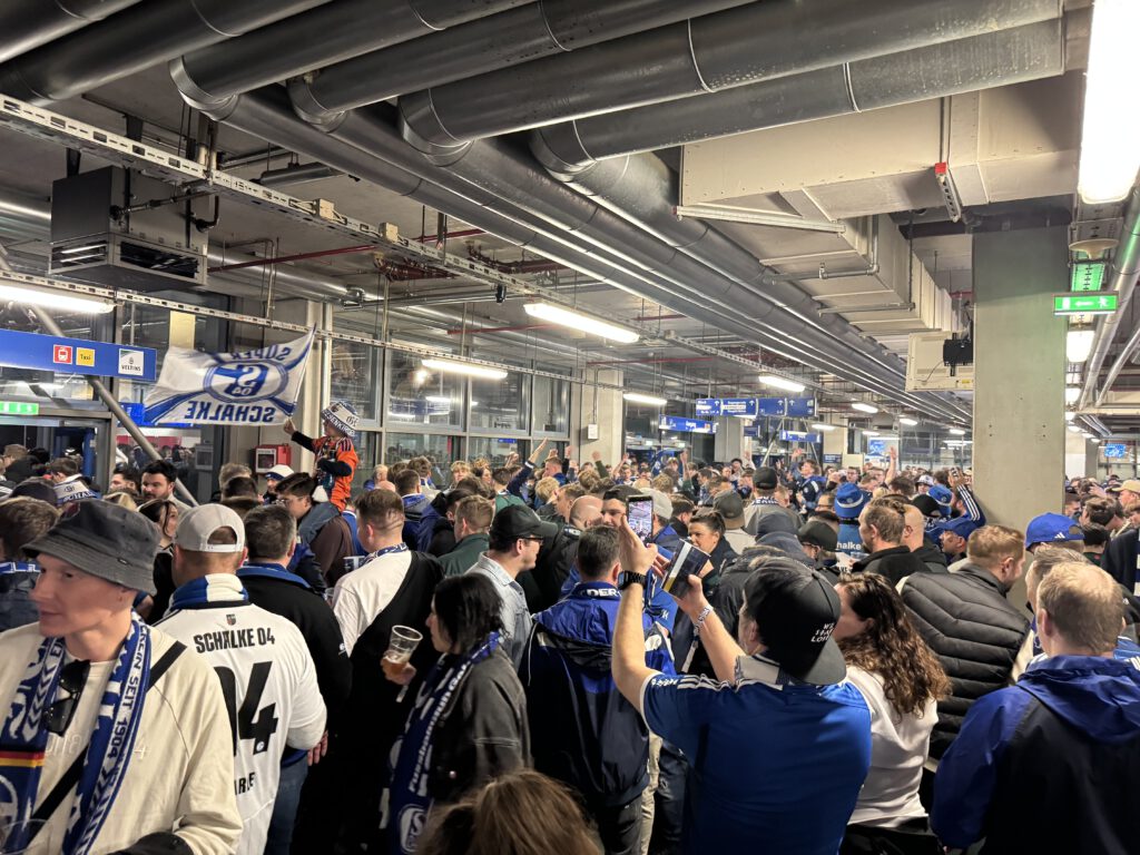 Während sich beide Trainer in der Pressekonferenz einig sind, dass es ein intensives Spiel war, in dem Schalke aufgrund der besseren Torchancen letztlich knapp, aber verdient gewonnen hat, geht die ausgelassene Party innen im Arenaumlauf und auf dem Arenaring draußen weiter. Aber Kenner wissen: Gegen das, was im Falle des hoffentlichen Aufstiegs los ist, ist das nur ein netter Kindergeburtstag…