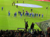 Es ist ein Abendspiel, das heißt: Beim Steigerlied ist Licht aus und Emotionen an angesagt! Danach vertreibt sich die Nordkurve die Zeit bis zum Vereinslied mit dem Wechselgesang „Schalke!!!“ – „Nullvier!!!“ mit der Südkurve, alle sind bereit! Blau und Weiß, wie lieb ich Dich wird dann wie immer mit voller Kapelle und Schal- und Fahneneinsatz geschmettert.